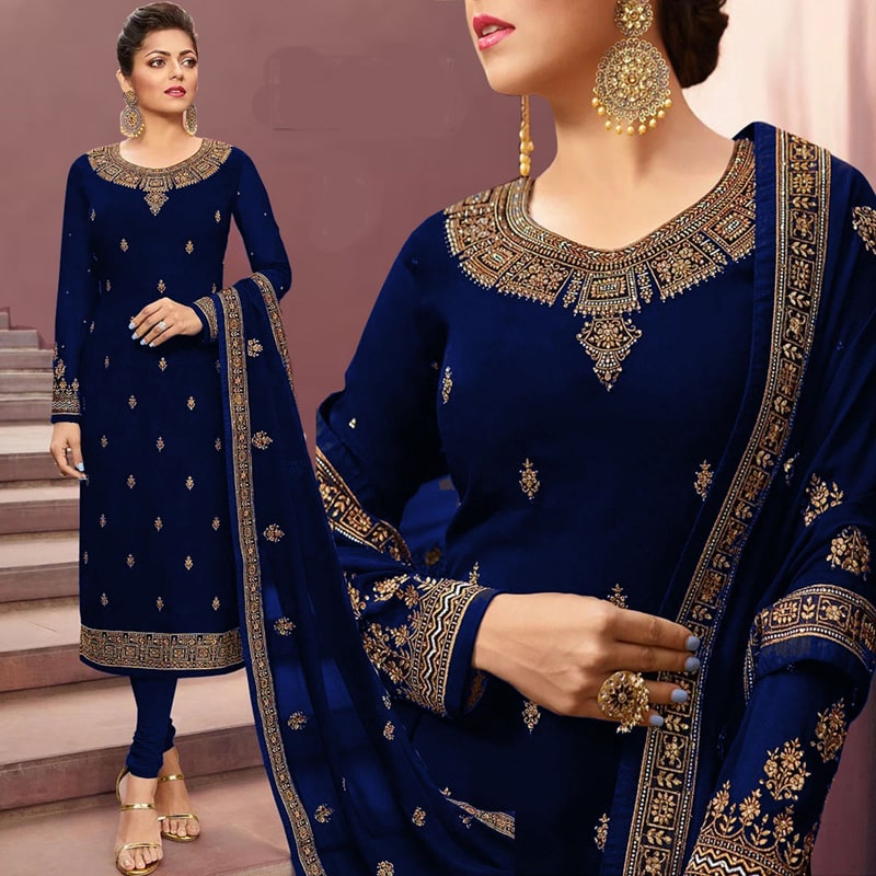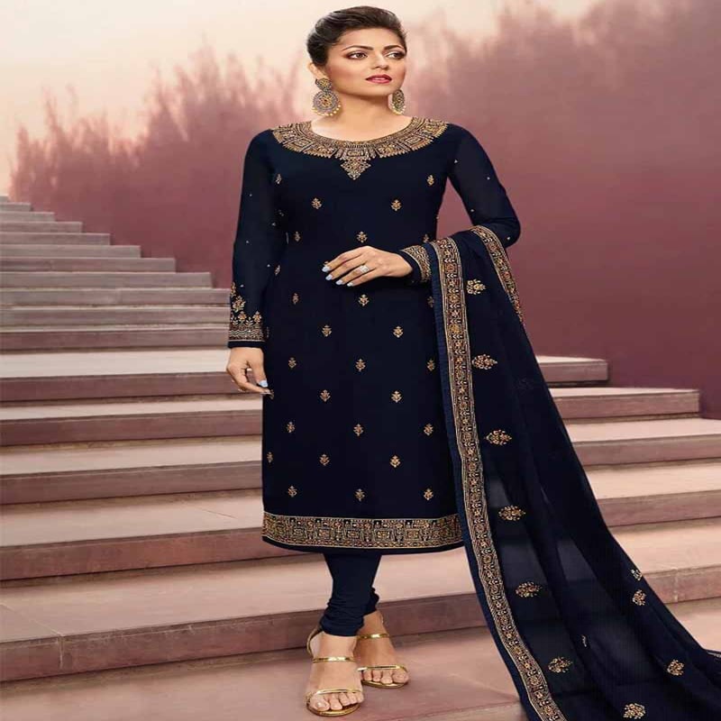 Type :Churidar Suit Occasion :Festival Wear, Wedding Wear, Party Wear, Diwali, Eid, Karva Chauth, Sangeet, Mehndi, Guest Of Wedding Wear Color :Dark Navy Blue Material :Top - Georgette, Bottom - Santoon, Dupatta - Georgette Work :Resham Work, Zari Work, Stone Work Package Contents :Top (Included Lining), Bottom and Scarf