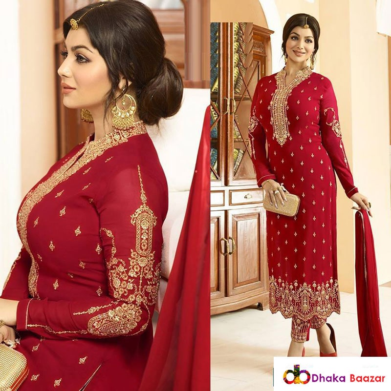 ফ্যাব্রিক্সঃ পিউল ওয়েটলেস ইন্ডিয়ান জর্জেটের উপর পুরো জামায় এম্ব্রয়ডারি, হাতায় এম্ব্রয়ডারি, শিফন ওড়না। বাটার সিল্ক সালোয়ারে এম্ব্রয়ডারি।