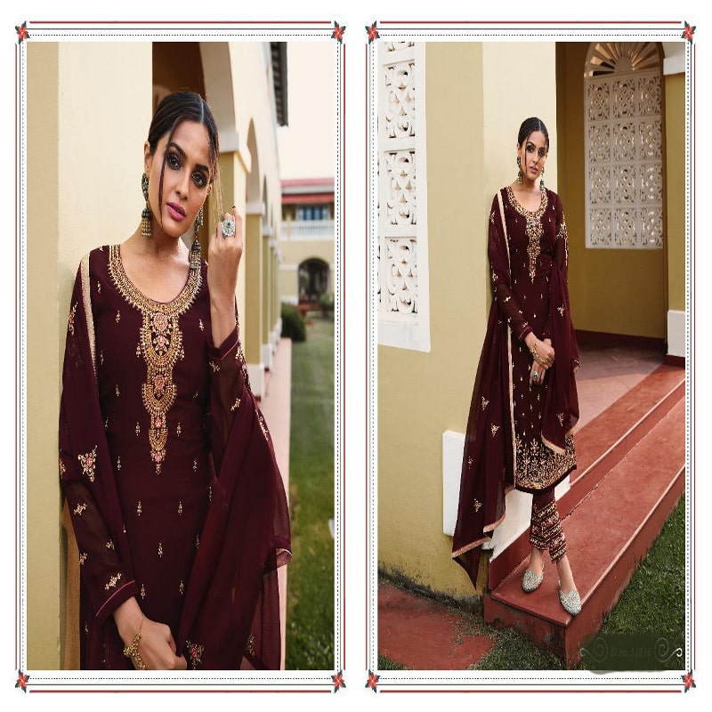 BRAND : STYLISHTA CATALOGUE : ZISA VOL 65 FABRIC : GEORGGET top - goergette with work dupatta - georgette with work bottom - dull santoon Size : Unstitched