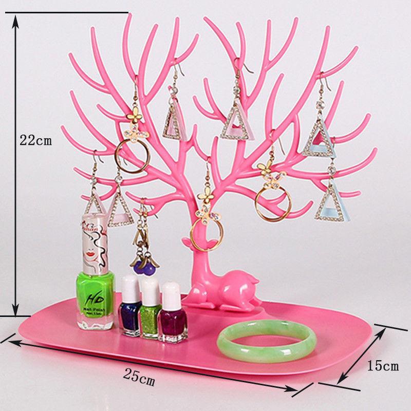 The Creative Deer Tree Jewelry Rack made of ABS Plastic with good flexibility Size:- 25*15*22cm /9.8*5.9*9inches. Jewelry space-saving holder, it's also a stylish, sophisticated and award-winning piece of art. Each branch on this tree-shaped hanger can be used to give each of your favorite necklaces, bracelets, and rings their own spot when they're not being use. And the dish at the bottom is great for wallet, phone, pen, cosmetics,etc. With fairly sturdy design you will always have your jewelry organized, tangle-free,and ready to be worn. Beautiful tree hooks/ branches design. Multi-function selections suit your needs conveniently and perfectly.