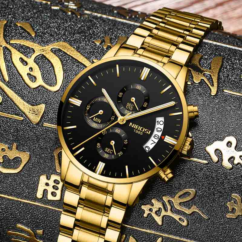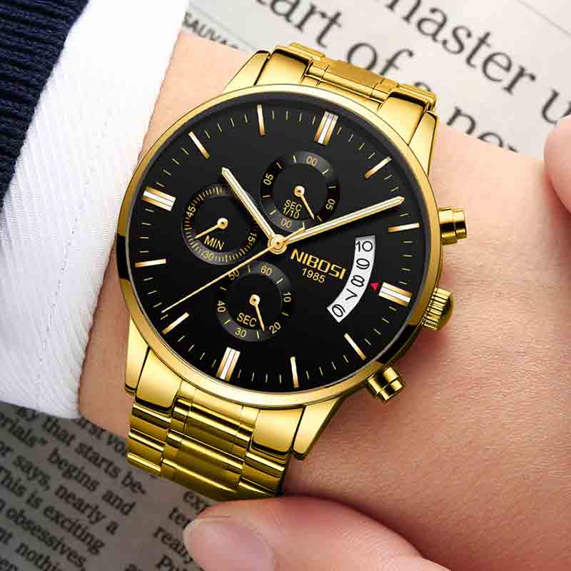Brand Name:NIBOSI Item Type:Quartz Wristwatches Band Width:22mm Feature:Complete Calendar,Luminous Hands,Water Resistant Clasp Type:Push Button Hidden Clasp Movement:Quartz Style:Dress Case Thickness:10.5mm Case Shape:Round Water Resistance Depth:3Bar Boxes & Cases Material:Paper Dial Window Material Type:Hardlex Dial Diameter:43mm Band Length:7.87inch Band Material Type:Stainless Steel Case Material:Stainless Steel Relogio nibosi Color:Gold Watch,Blue Watch,Black Watch,Gold and black watch Relojes Hombre 2018 Stype:Fashion Watch,Casual Watch,Business Watch,Luxury Watch Relojes para hombre Stock:NIBOSI Original Male Watch luxury Gender for Kol Saati:Male / Man / Boy / Unisex /Relogio Masculino Package Contents:Quartz Watch, Elegant Watch Box, English Instructions,Warranty Card Dials Of The Wathces:All of Sub-dials are good working Special Features:1/10 Chronograph Watch Men; Luminous Hands; Waterproof/Calendar Date Dress Watch Style:Militry / Dress / Business / Casual / Sports Gift for holiday:Marriage, adult ceremony, birthday, Christmas, New Year, Black Friday Stock:NIBOSI Original Analog Quartz Watch